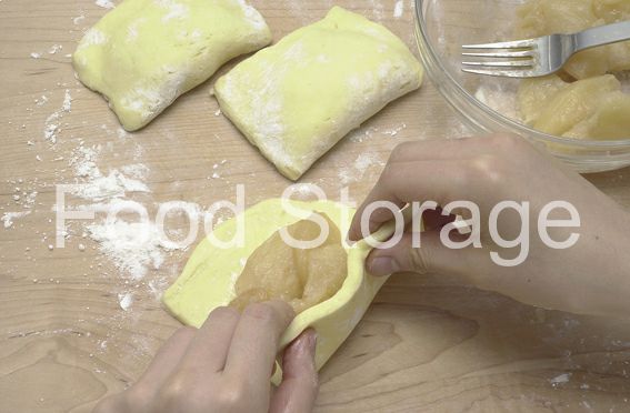 4に3のフィリングをのせて、半分に折り、周囲をフォークなどで押さえて閉じる。