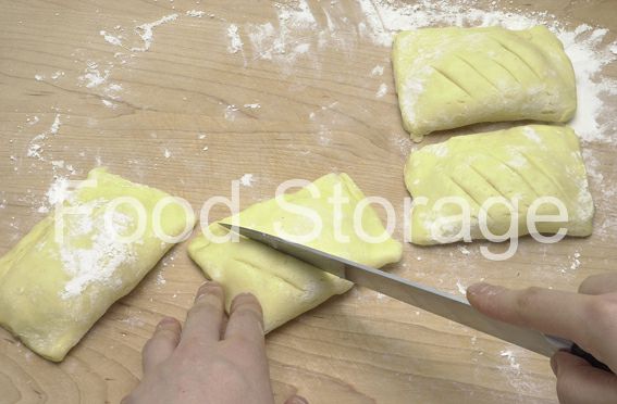 表面に包丁で切り込みを入れ、クッキングシートを敷いた天板に並べ、溶き卵をハケなどでぬって190℃のオーブンで20分焼く。 |