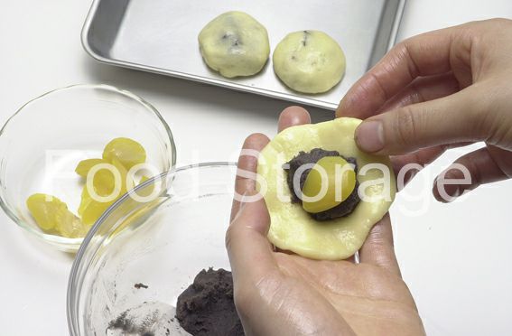 生地を平たく伸ばし、クリームを16等分にして包む。 |