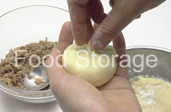 生地を作る。ボウルにBを混ぜ合わせ、ひとまとめにする。8等分して丸めた生地を打ち粉をした手の上で平たくのばし、1を包み、上をつまむようにして閉じる。