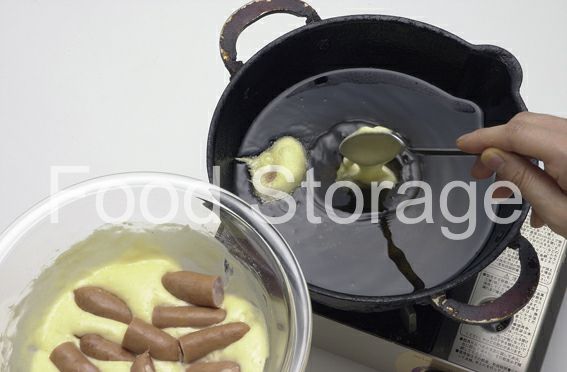 切ったウインナーソーセージを1に絡めて180℃に熱した揚げ油に入れ、生地が浮き上がり、ふくらんできたら裏返し、こまめに返しながらきつね色になるまで揚げる。ペーパータオルにとって油をきる。