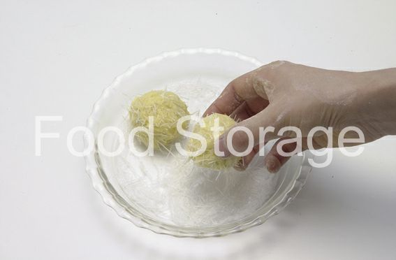 | 肉あんを詰めたドーナツ風の生地に、春雨をまぶして揚げます。パリパリとした春雨の食感を楽しんで。 |