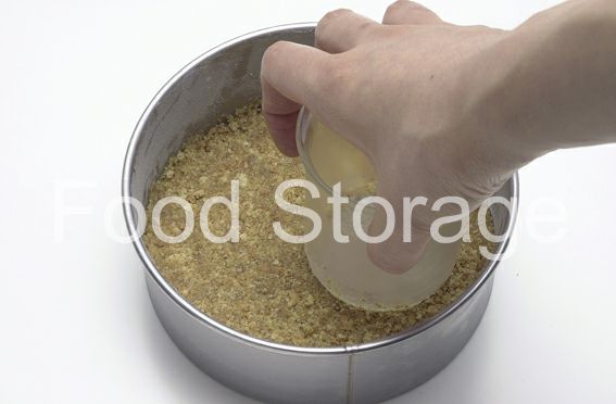 砕いたクラッカーをボウルに入れ、溶かしバターを混ぜ合わせる。