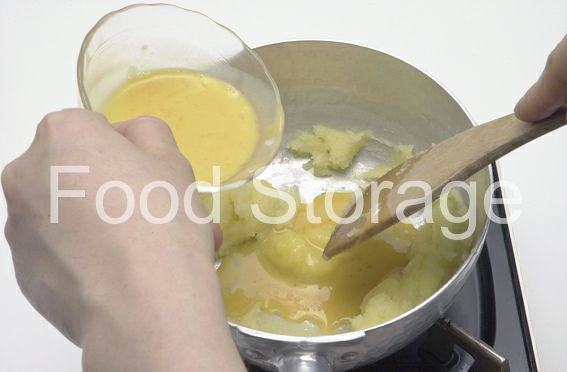 1を火から下ろし、溶き卵を3〜4回に分けて加え、そのつど手早く混ぜて滑らかな生地にする。