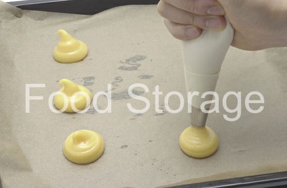 2の生地を丸口金をつけた絞り出し袋に入れ、クッキングシートを敷いた天板に間隔をあけながら直径5cmに絞り出す。高く絞るのが、ふくらませるコツ。