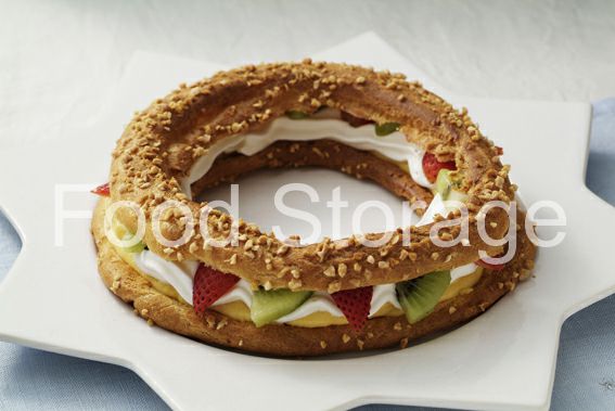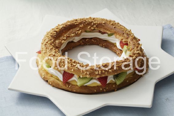 3を横半分に切り、4と5を絞っていちごとキウイフルーツを飾り、上からさらにクリームを絞って、シューをのせる。 |
