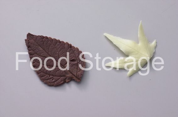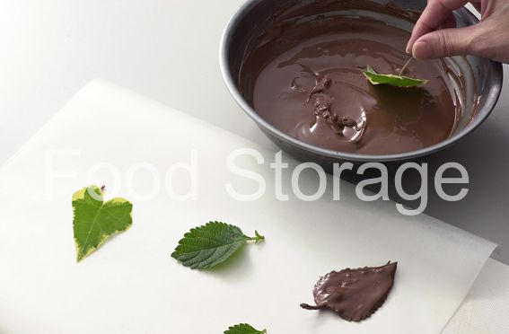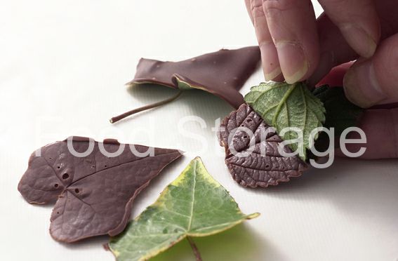 それぞれのチョコレートはテンパリングし、葉っぱの片面だけにつける。