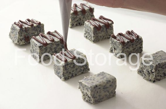 パラフィン紙で作った絞り袋にテンパリングしたミルクチョコレートを入れ、2の上に絞り出して模様をつける。 |