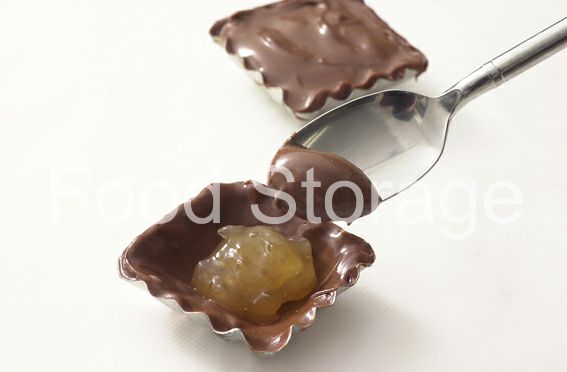 ビターチョコレートはテンパリングし、型に入れてから逆さまにして余分なチョコレートを戻し、冷蔵庫で冷やし固める。 |
