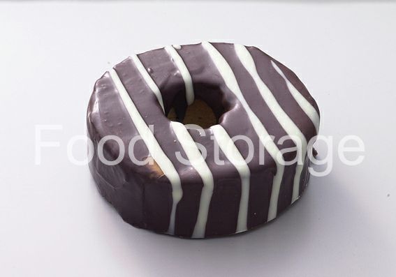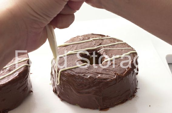 パラフィン紙で作った絞り袋にテンパリングしたホワイトチョコレートを入れ、2の上にストライプに絞り出し、冷やし固める。 |