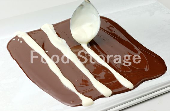 バットを裏返してクッキングシートを敷き、テンパリングしたビターチョコレートを2〜3mm薄さにのばす。その上に同様にテンパリングしたホワイトチョコレートを線状にのせる。