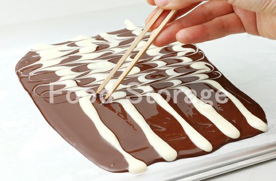 1の表面を竹串などで、ホワイトチョコレートの線と垂直に線をひくようにして、マーブル模様をつける。