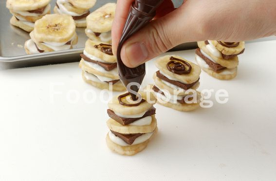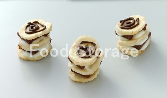 板チョコレートはバナナチップの大きさに合わせて切り、Aはよく混ぜ合わせる。バナナチップ、A、チョコ、Aの順にのせてバナナチップではさみ、さらにもう1段、同様にのせる。 |