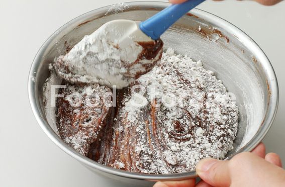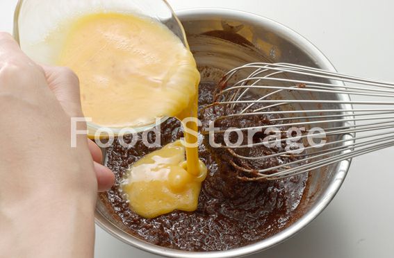 ビターチョコレートはテンパリングし、Aを加えて泡だて器でよく混ぜ合わせる。溶き卵を数回に分けて加え、混ぜ合わせる。 |
