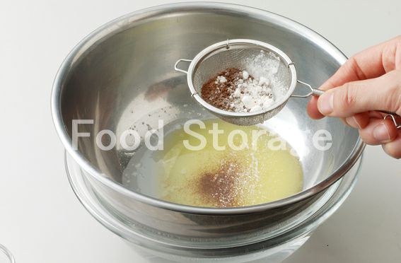ボウルにAを入れて湯せんで温め(60℃くらいの湯にボウルごとつける)、バターが完全に溶けたら1、Bをふるい入れて混ぜ合わせる。 |