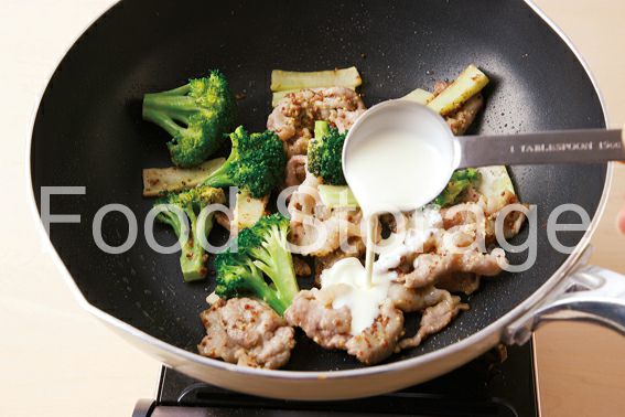 1.豚肉は塩、こしょうをふって、小麦粉を軽くまぶす。2.ブロッコリーは小房に分け、茎の部分も厚く皮をむき、短冊切りにする。3.フライパンにオリーブ油を熱し、1を炒めてきつね色になったら、2、Aを加え、ふたをして2〜3分蒸し焼きにする。4.ふたを取り、強火にして水分を軽く飛ばし、生クリームを加えてさっと絡め、塩、こしょうで味を調える。 |