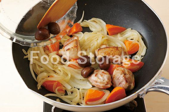 玉ねぎが色づいてきたら、2の鶏肉、むき甘栗を加えて炒め合わせる。 |