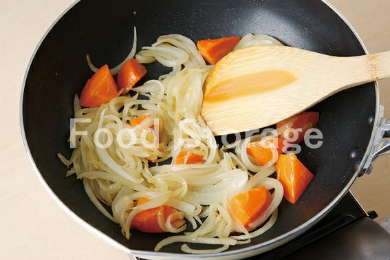 2のフライパンに残りのバターを入れ、中火で玉ねぎ、にんじんを炒める。 |