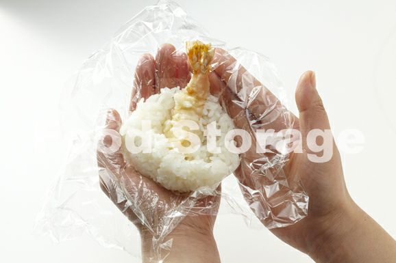 ラップにご飯の半量をのせて中央をくぼませ、えびの天ぷらの尾を持ってのせ、ラップごと両手で包むように三角に握る。同様にもう1つ作る。