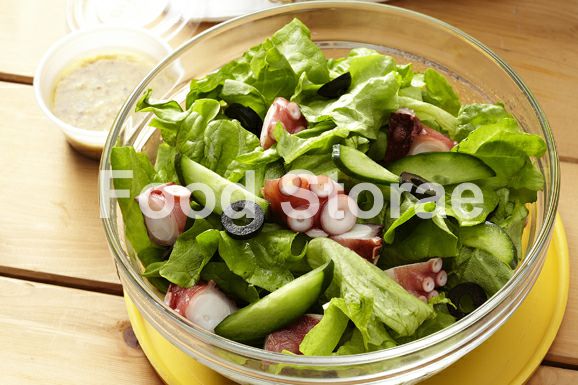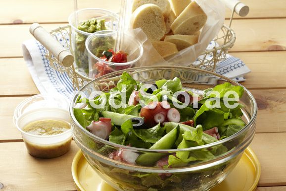 ゆでだこはブツ切りにして、ブラックオリーブは輪切りにする。グリーンリーフは食べやすく切り、きゅうりは縦半分に切って斜め薄切りにする。フレンチドレッシング、粒マスタードを混ぜ合わせてドレッシングを作る。 |