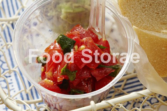 たこの粒マスタードサラダはふたのできる容器に入れ、ドレッシングは別の容器に入れる。ひとくちベーグルは紙袋に詰め、アボカドディップ、トマトディップは容器に入れてふたをする。 |