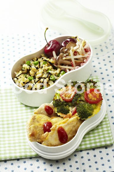 二段式弁当箱の片方に鶏ささみのピカタ、ブロッコリーのフランの順に詰め、ピカタにトマトケチャップをのせる。もうひとつの弁当箱に洋風ひじきご飯、カップに入れたもやしときのこのホットサラダの順に詰め、空いたスペースにアメリカンチェリーを詰める。 |