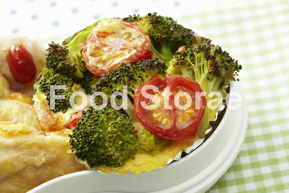 鶏ささみのピカタをのせた天板にブロッコリーのフランものせ、温めたオーブントースターで5~6分焼く。 |