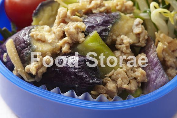 玄米ご飯を弁当箱に詰め、なすとひき肉のレンジ炒め、しそ卵、ナムルの順に詰め、空いたスペースにプチトマトを詰める。 |