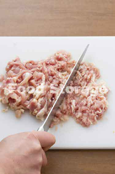 赤ピーマンは5mm幅の細切りにする。鶏肉はそぎ切りにしてから粗みじん切りにする。