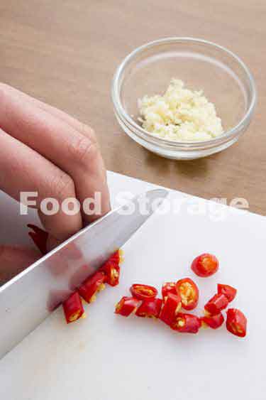 唐辛子は小口切りに、にんにくはみじん切りにする。