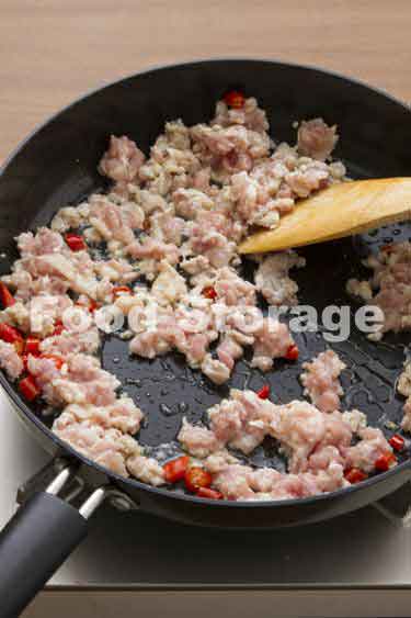 フライパンにサラダ油1と1/2、2 を入れて弱火にかけ、香りが立ったら鶏肉を炒める。