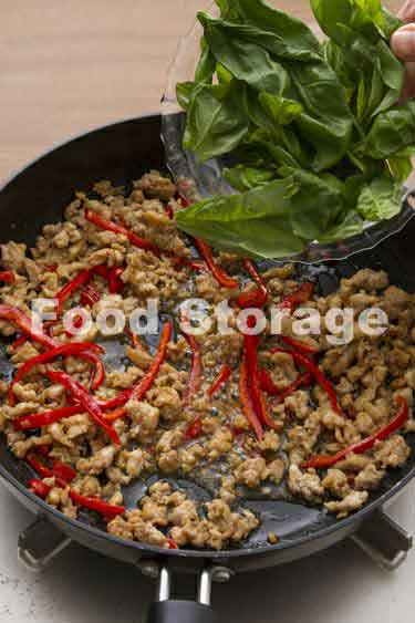 肉の色が変わったらピーマンとAを加えて炒め合わせ、バジルを加えて火を止め、さっと混ぜる。