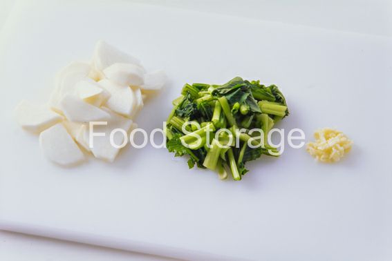 かぶは皮をむいて薄いいちょう切りにし、葉はざく切りにする。にんにくはみじん切りにする。 |