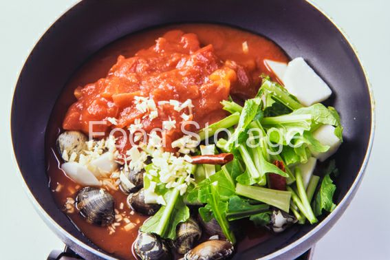 スパゲティ かぶ にんにく あさり オリーブ油 A(カットトマト(缶詰) トマトピューレ 赤唐辛子 白ワイン 塩、こしょう