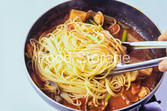 3に火が通ったら、ゆであがって水けをきったパスタを加えて絡め、塩、こしょうで調味する。 |