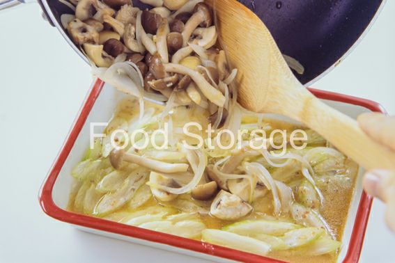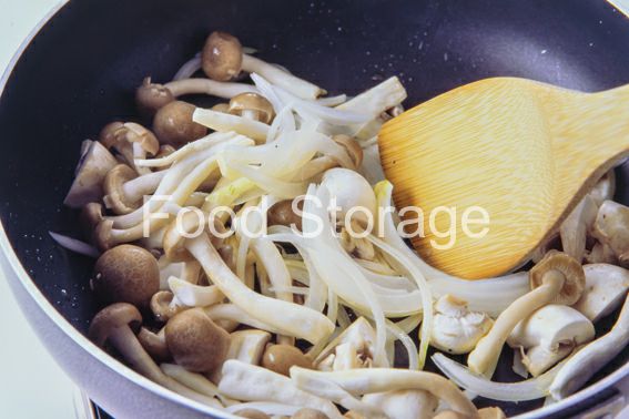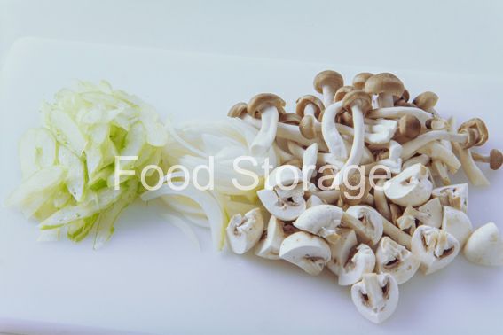 玉ねぎ、セロリは薄切りに資、しめじは石づきを落としてほぐし、マッシュルームは4等分に切る。 |