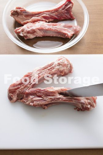スペアリブはフォークで全体を数か所刺し、骨と肉の間に切り込みを入れて、塩、こしょうをふる。