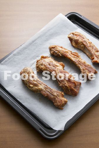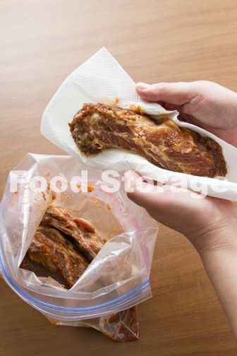 2のスペアリブの汁けをペーパータオルで軽くふき取る。