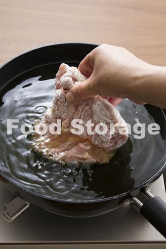 1に片栗粉をまぶし、170℃に熱した揚げ油に皮目を下に入れる。