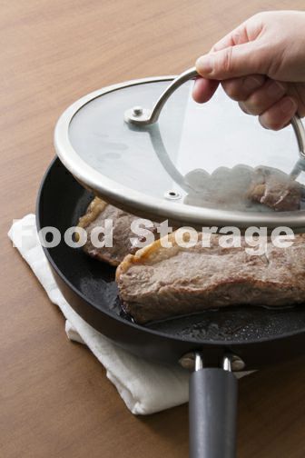 2にふたをして弱火にし、ミディアムレアは2~3分、ミディアムは3~4分蒸し焼きにする。火を止めてフライパンをぬれ布巾の上に置いて肉汁を落ち着かせる。 |