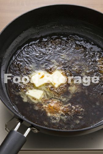 小鍋に赤ワイン100mlを入れて煮詰め、バター40g、しょうゆ小さじ1/2を加えてひと煮たちさせ、火を止める。