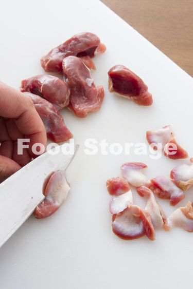 フライパンにサラダ油を中火で熱し、砂肝を炒め、酒をふってふたをして、5分程度蒸し焼きにする。