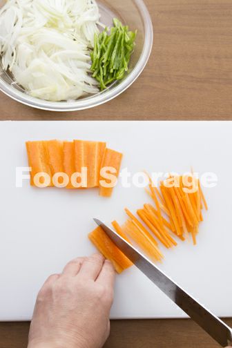 玉ねぎは薄切りに、ピーマンはヘタと種を除いて細切りに、にんじんは皮をむいて細切りにする。