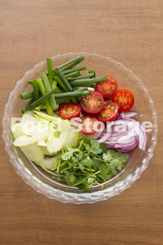 紫玉ねぎは薄切りにする。万能ねぎは㎝長さに切る。セロリは㎜幅の斜め薄切りにする。プチトマトはヘタを除いて横半分に切る。香菜はざく切りにする。 |