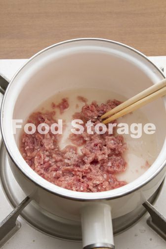 鍋に鶏がらスープとひき肉を入れてほぐし混ぜ、中火にかけて肉に火を通し、ざるにあげて軽く汁けをきる。