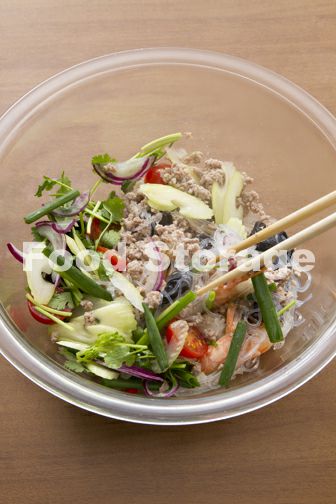 | 酸味と辛味が複雑にミックスされたタイの春雨サラダ。春雨と具材をさっとあえて、ほのかに温かいうちに食べる。 |