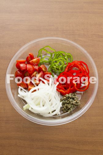 玉ねぎは繊維を断つように薄切り、ピーマン、赤ピーマンは種とヘタを除いて薄い輪切り、プチトマトはヘタを除いて4つ割り、ケッパーは粗みじん切りにする。