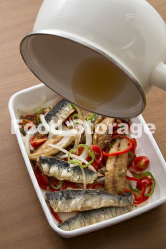 | 酢をワインビネガーで作る、フランス風南蛮漬け。日本の南蛮漬けはマイルドな甘酢に漬けるが、こちらは口の中がキュッとなるようなすっぱい甘酢に漬ける。 |