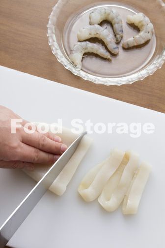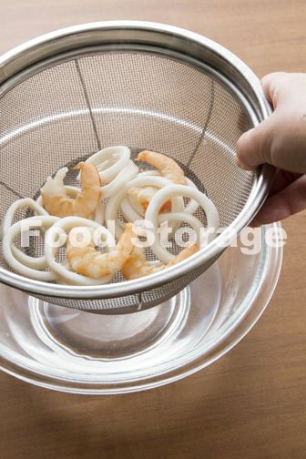 いかは皮をむき、1㎝幅の輪切りにする。えびは背ワタを除いて尾まで殻をむく。