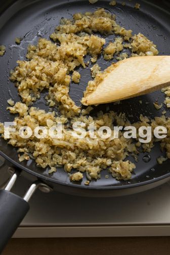 2に玉ねぎを加え、弱~中火でじっくりと炒める。バター、にんにく、しょうがを加え、玉ねぎがあめ色になるまで炒める。